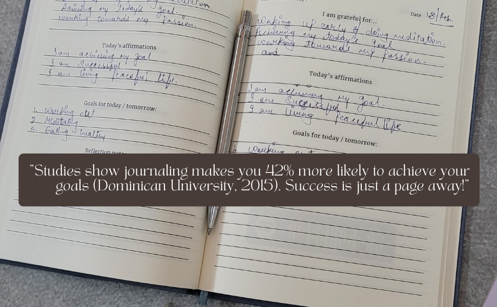 Studies show journaling makes you 42% more likely to achieve your goals (Dominican University, 2015). Success is just a page away!